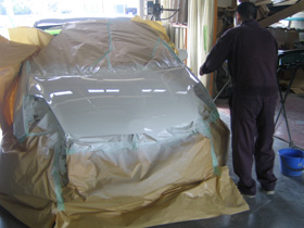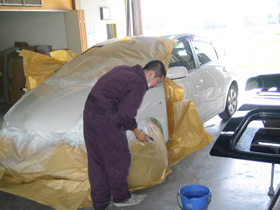 | 3 パテが乾ききったら上からサフェーサーなどの下処理を施したのち、ボディーの色により何層か塗り分けながら塗装していきます。 | 4 塗料をじっくり乾燥させたあと、ポリッシャーを使い磨きをかけていき、板金塗装の完了です。 |