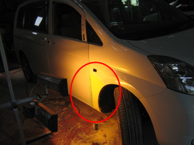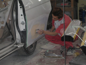 | 1 凹んだ車のボディーにパテを盛り、削りだしながら形を元に戻していきます。 | 2 パテを乾燥させます。